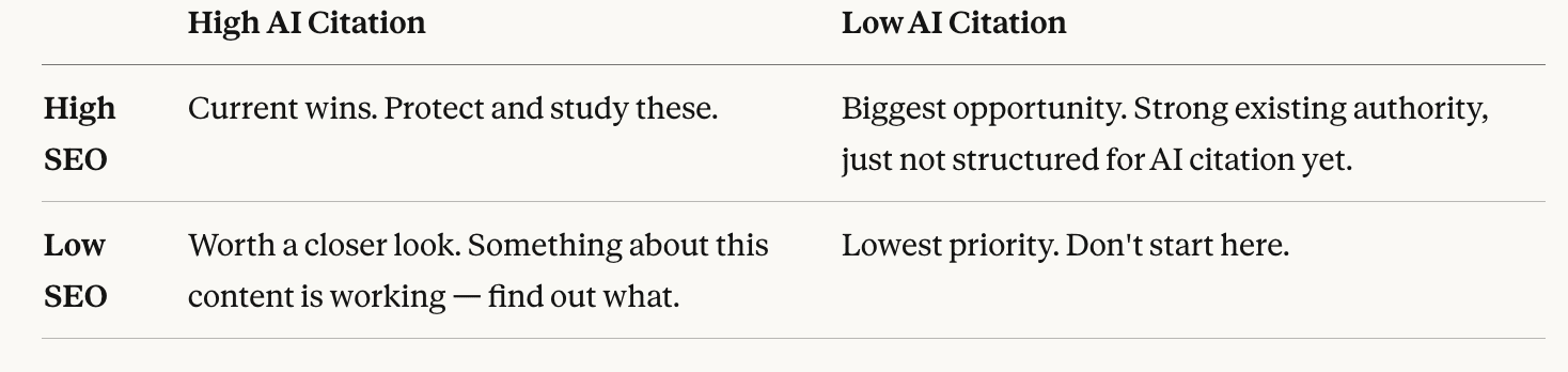 The other thing I’ll say is that AI citation rate isn't just a vanity metric. It's a distribution channel. When ChatGPT or Perplexity cites your content, it pulls users directly into your perspective, your framing and your recommendations around the topic you’re working to own. Does ranking well for keyword phrases still matter? Yes! It’s still part of the puzzle around AI search…but it’s not the whole game. The question is: How do you close the gap between showing up on page one of Google search results and getting cited by LLMs? How to close the gap between ranking and AI search citationPages with real authority and years of SEO equity behind them are getting skipped over in AI-generated answers, while newer, more specific and insightful content from competitors gets cited instead. LLMs care more about those content factors than whether or not it targets a keyword phrase. The good news is that closing the gap between ranking well and getting cited doesn't require a full content overhaul. You just need to know exactly where you stand, which pages are closest to crossing over, and what's keeping them from getting cited. Here’s how to do this assessment. Part 1: The Visibility Gap Audit Before you create anything new, you need to know where your existing content stands in AI search. Not where it ranks. Where it gets cited. Step 1: Pull your top 20 pages. Use whatever analytics tool you have and sort by organic traffic over the last 90 days. From there, grab the top 20 URLs and the primary keyword each page targets. These are your highest-leverage assets, which makes them the right place to start. Step 2: Test each page against its target query in AI search. Run each keyword as a natural-language question in ChatGPT, Perplexity, and Google AI Overviews. (Example: "best practices for B2B email onboarding" rather than the exact keyword string.) Screenshot or log whether your domain appears in the response, whether it's cited as a source, and where in the answer it shows up. Step 3: Build a simple 2x2. Plot each page against two axes: SEO performance (high/low) and AI citation rate (high/low). This gives you four categories: The "High SEO / Low AI" bucket is where you'll spend most of your time. These pages already have topical authority and inbound links (the content just isn't structured in a way AI systems know how to use.) Part 2: Competitive Citation MappingOnce you know where your content stands, you need to see the full competitive landscape. The real opportunities aren't just in upgrading your own pages, but in the queries where competitors are getting cited, (and you're not.) Step 1: Pick 15-20 high-intent queries in your space. These should be questions your buyers actually ask: evaluation questions, comparison questions, how-to questions tied to your product category. Not branded terms. The informational queries where AI is most likely to generate a synthesized answer. Step 2: Run each query and log who gets cited. For each query, note which domains appear as sources and how often. You're looking for patterns: Are the same 3-4 competitors showing up repeatedly? Are there queries where no one is getting cited consistently? Both are signals. Step 3: Identify your priority gaps. Two gap types matter most: