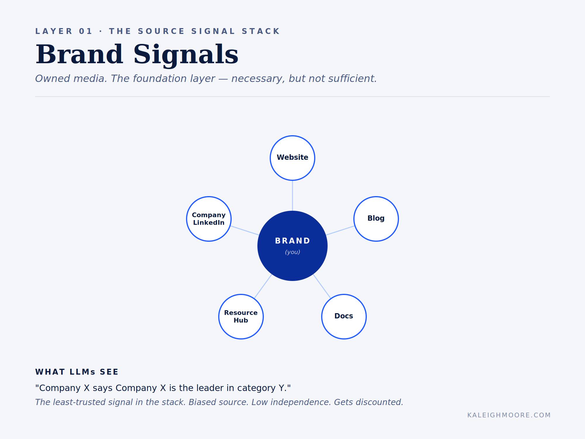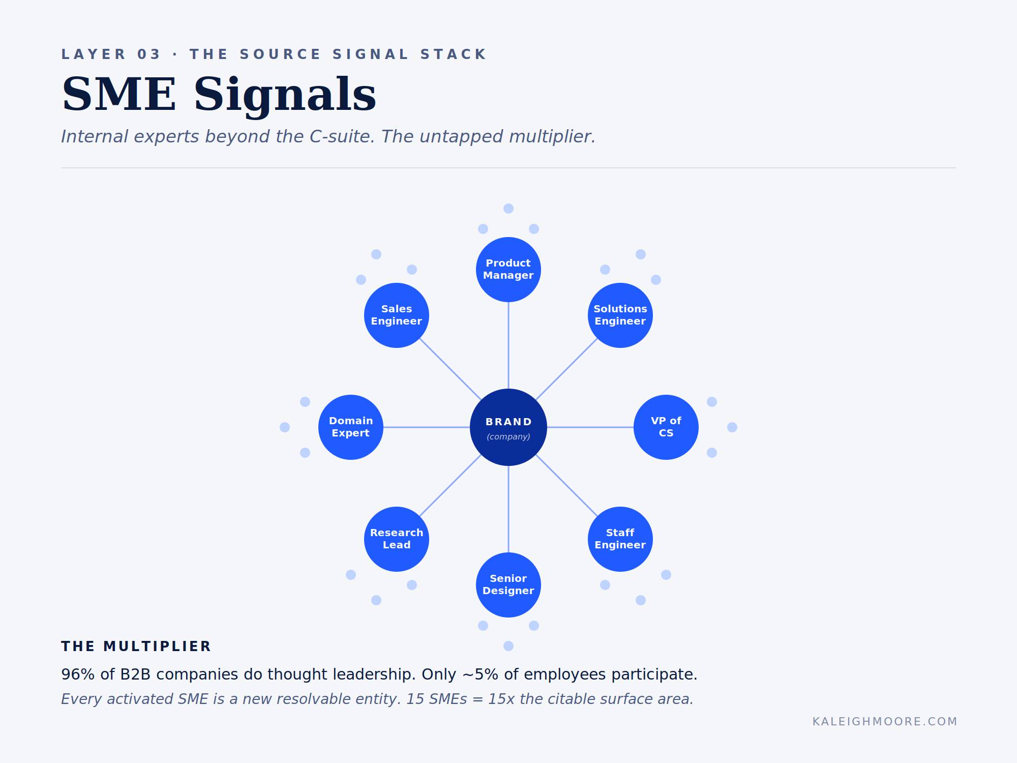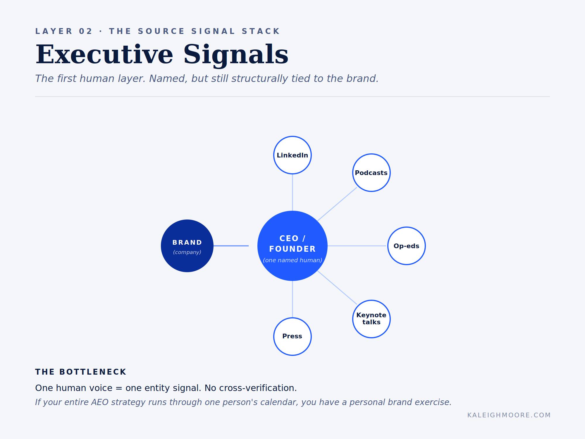 Read the list top to bottom, and you’ll see there's a principle hiding in it that most B2B marketers have not yet fully articulated: the further a source signal originates from brand control, the more weight LLMs give it. Brand-owned content is the least trusted signal in the stack. Earned community mentions are the most trusted. Executives and SMEs sit in between, and the independence dial moves as you go from Layer 2 to Layer 3. Executives are still structurally tied to the brand, while SMEs (especially non-managerial ones) can differentiate more from the company, leveraging their expertise as independent voices. This is the part most AEO content programs have backward, as they invest the most time, energy, and money into one of the layers LLMs trust the least. Layer 1: Brand SignalsBrand Signals are everything you own: your website, your blog, your resource hub, your company LinkedIn page, your product documentation, your category pages. This is the foundation layer. Without Brand Signals, LLMs have no canonical definition of what your company is, what it does, or which topics it has any business being cited on. Stripe's documentation is probably the closest thing the B2B world has to a perfect Layer 1: it's so authoritative and well-structured that it shows up as a source in AI answers about payments, developer APIs, and fintech infrastructure because nothing else on the open web explains those topics with the same clarity, depth, and rigor. That said, Layer 1 is also where most B2B content programs stop or get stuck. Two years of SEO blog posts with no author bylines, no named experts, no data that no other company has, no point of view anyone would remember…this is a content strategy that’s not going to do much for boosting your LLM citation rate. The reason Layer 1 alone can't carry a citation program has to do with the structuring here: An LLM evaluating "Company X says Company X is the leader in category Y" bumps up against the same issue a human reader would: The source isn't neutral; it has an obvious stake in the claim. LLMs discount self-referential brand content the same way an editor discounts a press release. "Doing Layer 1 well" means getting the table stakes right: bylined authorship, consistent entity descriptions, clear category definitions, structured data, and cited sources/original research. Volume doesn't fix a quality problem; it amplifies it. The test: if someone removed every instance of your company's name from your blog, would the remaining content still tell an LLM who you are and what you know? If the answer is no, you have a branding program, not an authority program. Layer 2: Executive SignalsExecutive Signals are the first human layer in the stack. Your CEO, founder, CMO, or chief product officer publishes under their own name across places like LinkedIn, op-eds, on podcasts, and at industry events. This layer matters because it gives LLMs something they can't get from Layer 1 alone: a named, identifiable human associated with your brand's topic areas. A well-run executive content program starts to build out a programmatic AEO approach around a real person who can be referenced, cited, and cross-verified independently of the company they work for. They become a source signal. We see this in action with folks like Patrick Collison at Stripe, Des Traynor at Intercom, and Tobi Lütke at Shopify. By the time LLMs started synthesizing answers on topical expertise, those execs had already spent 10 years being recognized as named experts in their respective domains. This is an important point about this layer: executives are still structurally aligned with the brand. An LLM's independence check treats a CEO saying the company is great roughly the same way it treats the company saying the company is great; they're related parties. Executive Signals are more trusted than Brand Signals because they're attached to a named human, but they are not fully independent. This is consistent with the recent Profound analysis of 1.4 million AI citations, which found that on ChatGPT and Google AI Mode, 59% of cited LinkedIn content comes from individual members rather than company pages; a sharp tell that AI systems are weighting human-authored signal above brand-authored signal. The common mistake at Layer 2 is that most B2B companies treat "our CEO has a LinkedIn presence" as evidence of a functioning thought leadership program. One person publishing once a week is a single-source signal with a single point of view (and no cross-verification.) If an LLM has one human voice associated with your brand and that voice disappears (the exec leaves, takes a sabbatical, goes quiet), your graph for this work collapses back down to Layer 1. Layer 3: SME SignalsLayer 3 is where the Source Signal Stack stops being a diagnosis and starts being an opportunity. Subject Matter Expert (SME) Signals are the non-executive internal experts at your company (product managers, solutions engineers, senior customer success leaders, staff engineers, researchers, domain specialists) who are publishing original perspectives under their own names. This is the layer almost every B2B content program has left completely inactive. Content Marketing Institute research shows that 96% of B2B companies create thought leadership content, but only 37% have employees with specialized knowledge contributing to those efforts. Of that 37%, fewer than 5% of the total employee roster is actually doing this type of work. Most B2B companies have a content team, a CEO who occasionally publishes, and an organizational chart full of experts who are structurally invisible to AI. Those SMEs within your organization who aren't publicly sharing their expertise are untapped source signals. Another 3-5 resolvable human experts associated with the company (each associated with the company's topic areas) are new, individual, and cross-verifiable signals for LLMs, each generating their own Layer 4 activity downstream. That’