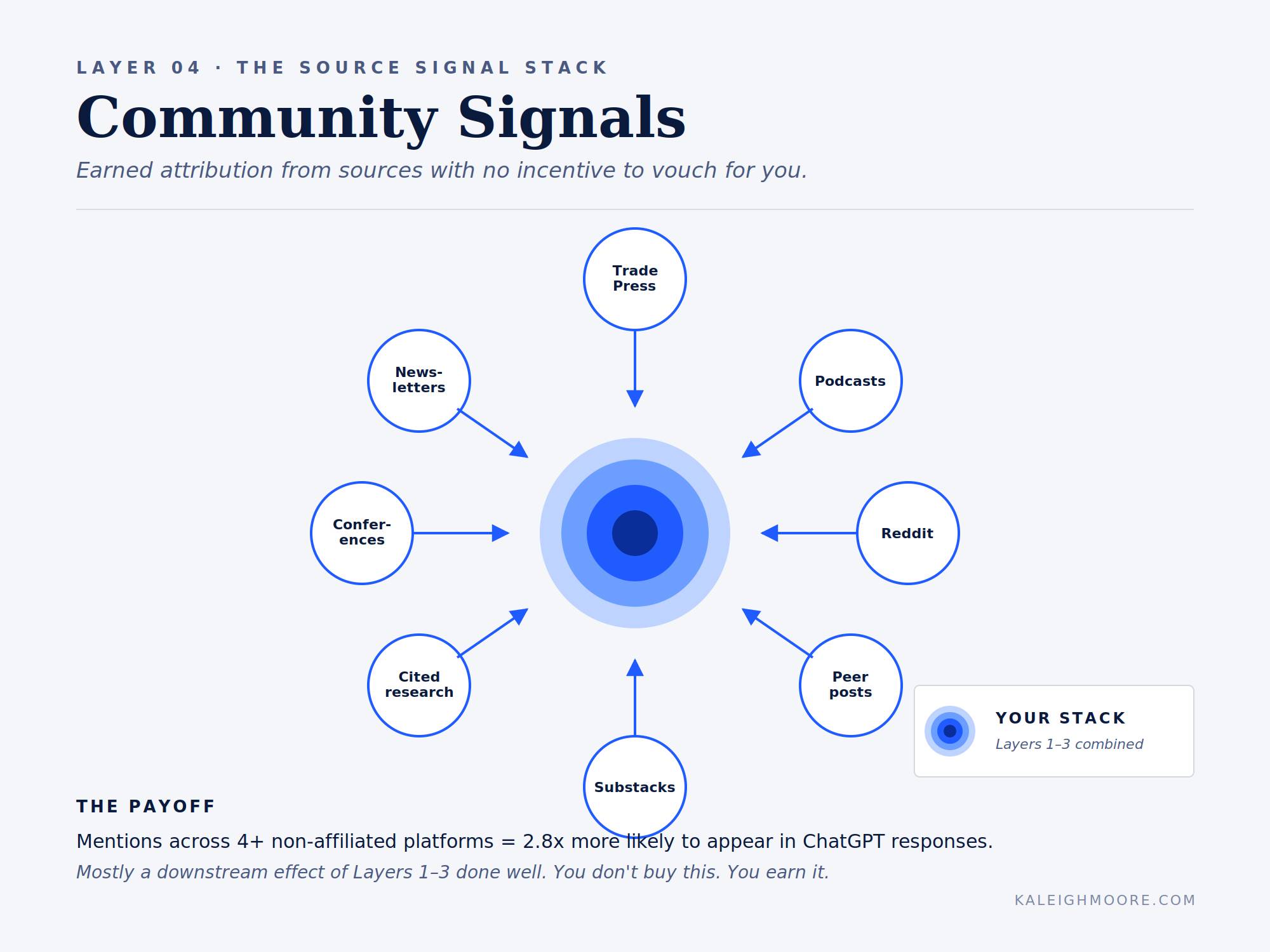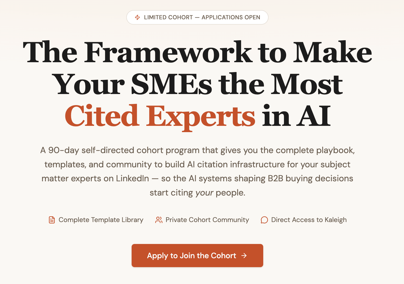 If only one of those four returns a strong yes, you have a top-heavy stack. That's the most common failure pattern in B2B: Layers 1 and 2 invested heavily, Layer 3 left thin, Layer 4 never materializing because the lower infrastructure isn't producing the people for the upper layer to amplify. My 2026 Prediction: The Source Signal Stack Will Become The Emerging Methodology Across the AEO LandscapeThe B2B brands that dominate AI search over the next 18 months will be the ones who figured out Layer 3 first (because Layer 3 is what makes Layer 4 inevitable, and the other two layers almost take care of themselves when Layers 3 and 4 are active). This is also a window, and it's narrower than it looks. Authority compounds. Once LLMs have anchored their entity graphs around a set of named humans at a competitor's company, the cost for your SMEs to displace them goes up significantly. The cheapest moment to build this infrastructure is before your category's AI citation patterns harden—which, based on what I'm seeing, is happening faster in B2B than almost anyone expected. The stack is the work. Join me, and figure out how to build yours. 'Til next time, Kaleigh Moore |