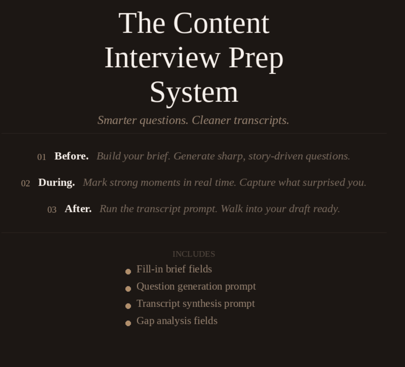 A three-phase system for preparing smarter questions, capturing better material, and turning any expert transcript into ready-to-use research before it goes into your AI tool of choice.